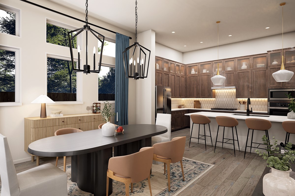 The contemporary kitchen overlooks the adjacent family and dining spaces and features a multi-function island, a step-in pantry and an open culinary layout.