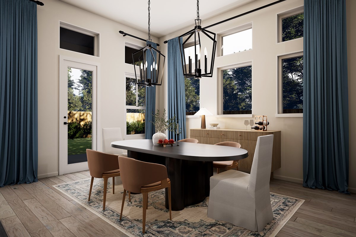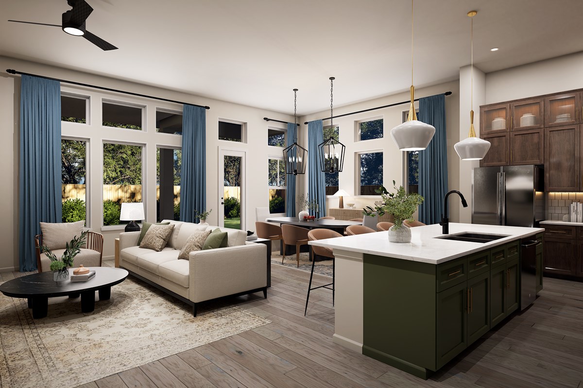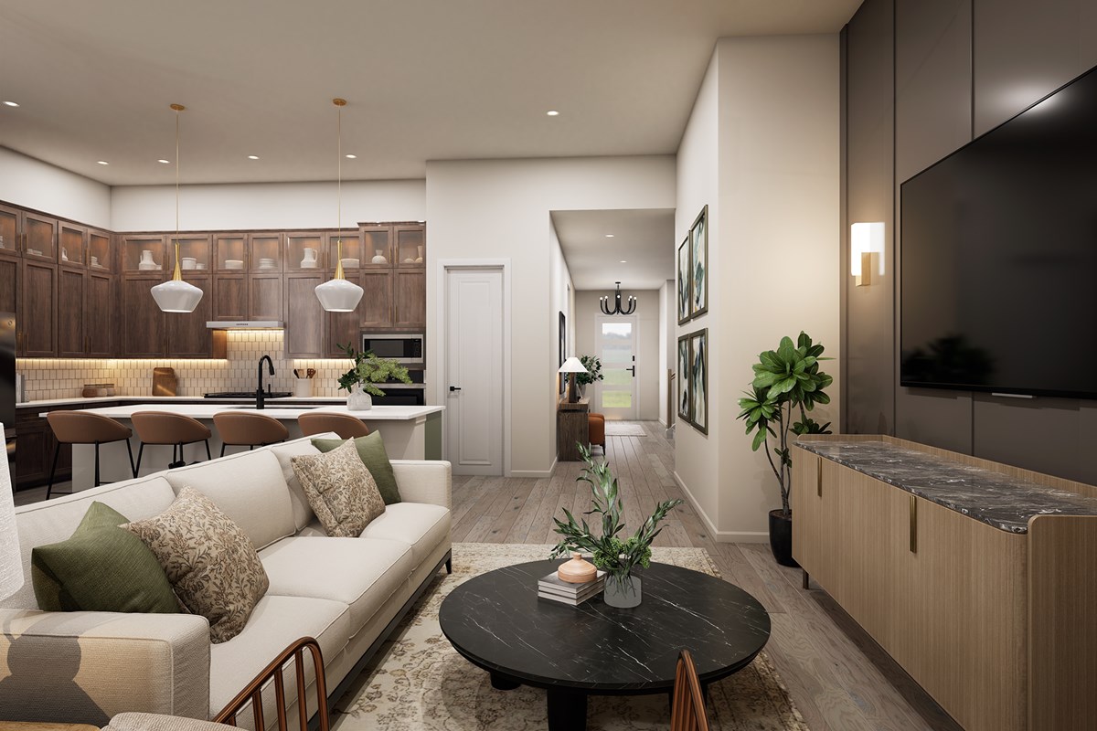 The Aster floor plan by David Weekley Homes in Mustang Lakes showcases a social lifestyle design while maintaining ample privacy and quiet for the bedrooms. The front door opens onto an expansive view of the sunlit family room and extends out to the backyard.
