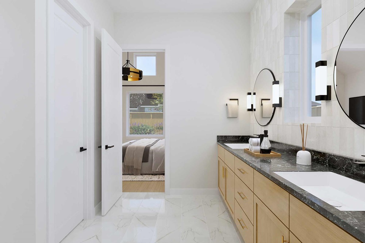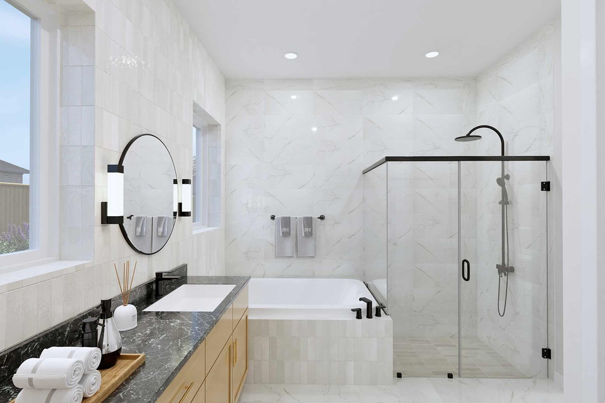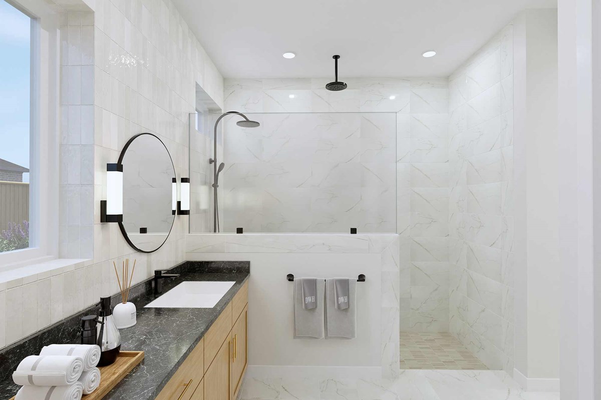 The streamlined kitchen creates an easy culinary layout for the resident chef while granting an open view of the adjacent living spaces. A luxurious en suite Owner’s Bath and walk-in closet contribute to the everyday getaway of the Owner’s Retreat.