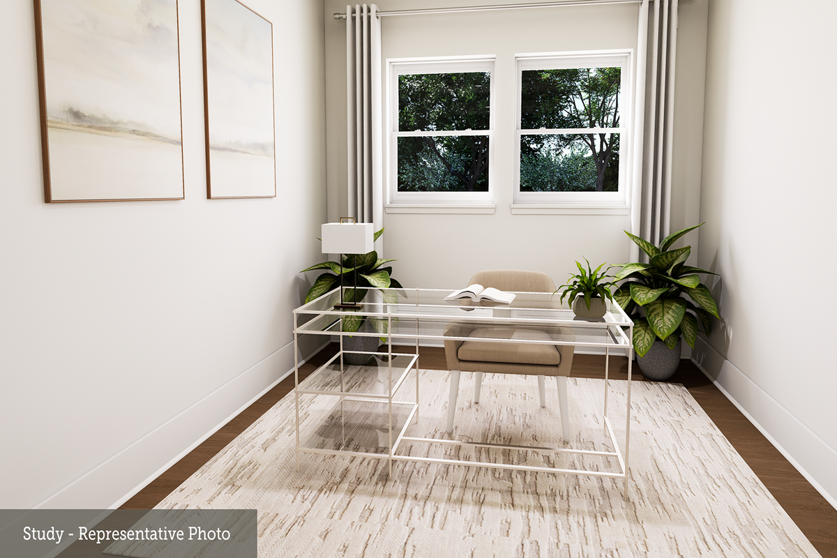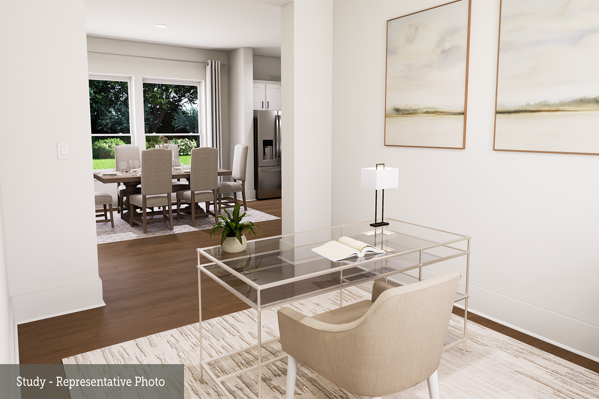 A center island and open sight lines contribute to the culinary layout of the contemporary kitchen. Design the home office, media studio or entertainment den you’ve been dreaming of in the front study.