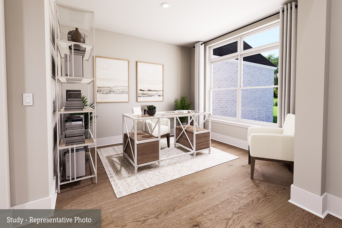 The kitchen creates an enhanced culinary atmosphere with a butler’s pantry, center island and open sight lines extending across the gathering spaces and out onto the covered porch. An upstairs retreat and pair of studies at the front of the home present versatile spaces for home offices or unique rooms of your own design.