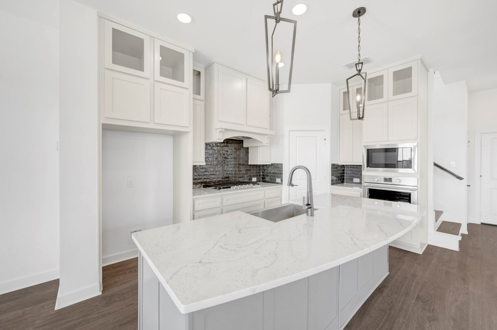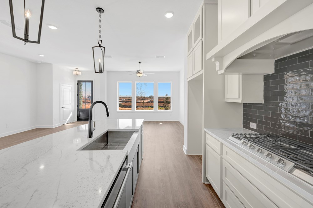 The contemporary kitchen showcases a dine-up island, corner pantry, ample prep space, and an expansive view of the sunny main level. Welcome guests and enjoy your outdoor leisure time from the covered porch.