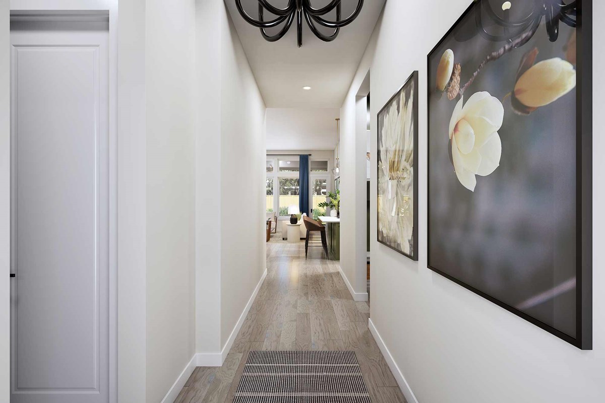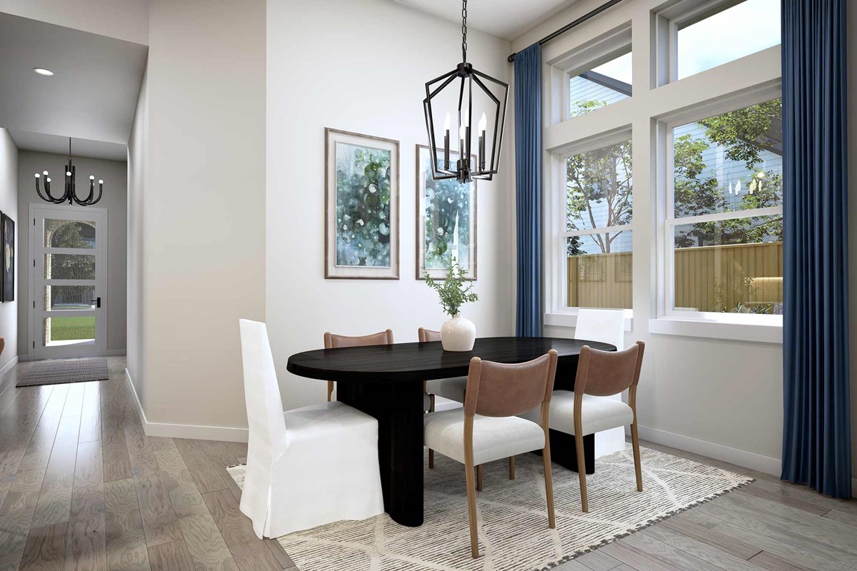 The Brownsville floor plan by David Weekley Homes in The Woodlands Hills blends timeless luxury with top-quality craftsmanship to create a uniquely welcoming single-family home. A welcoming view extending through the sunny family and dining spaces, and out to the covered porch, greets you from the moment you open the front door.