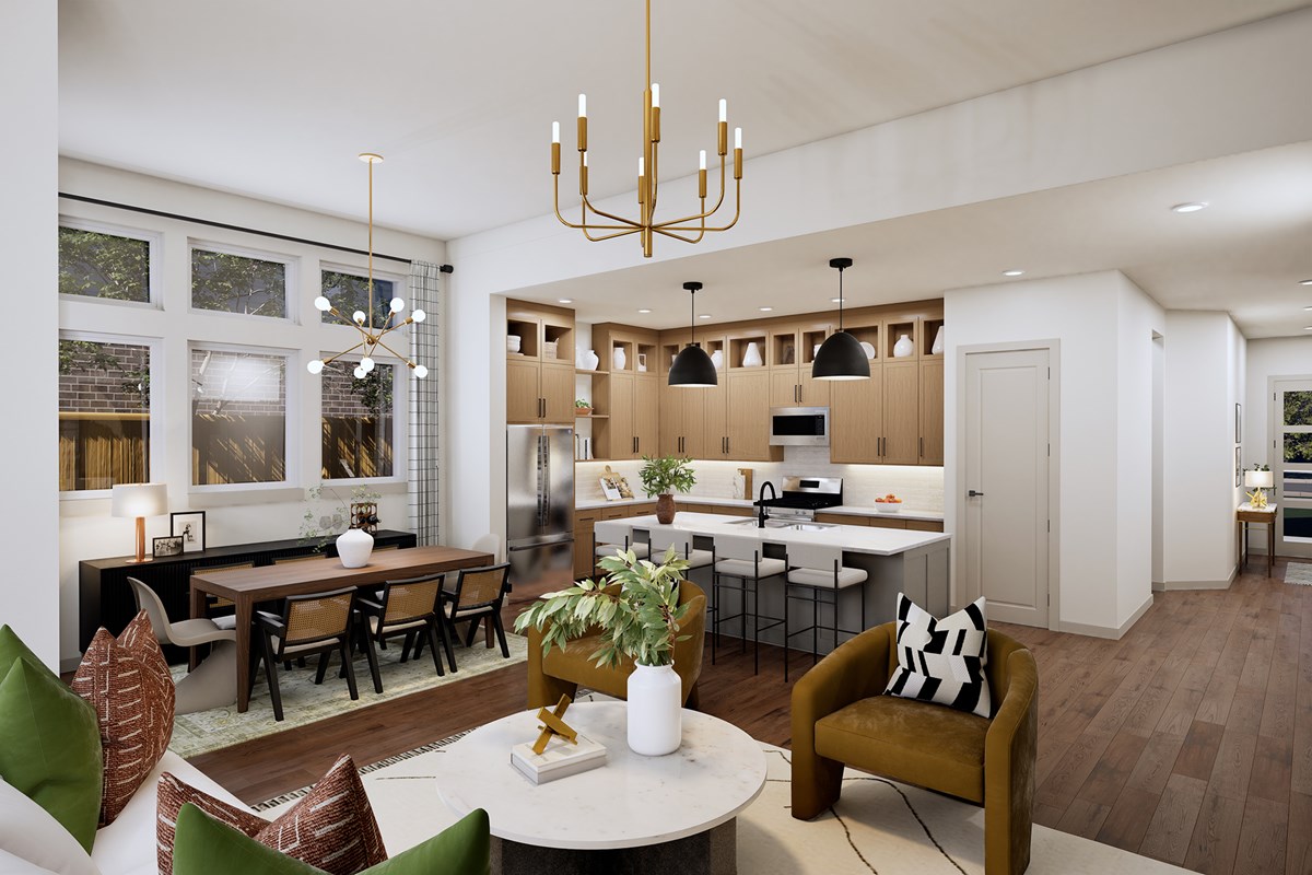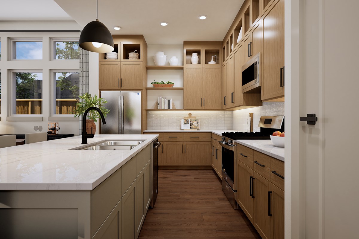 Comfort and luxury inspire every lifestyle refinement of The Violet floor plan by David Weekley Homes. A multi-function island and expansive view of the sunny living and dining spaces contribute to the culinary layout of the glamorous kitchen.