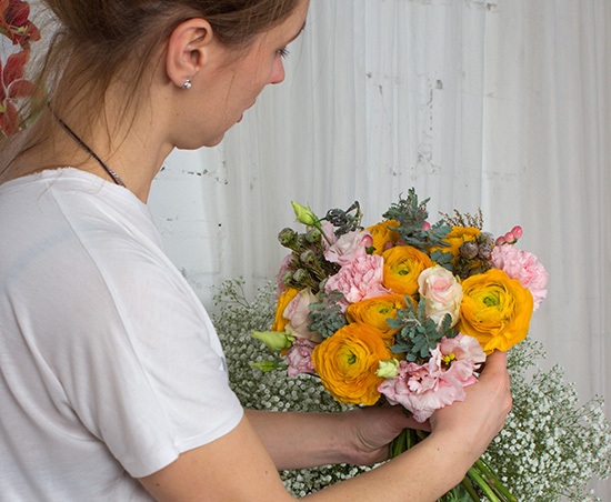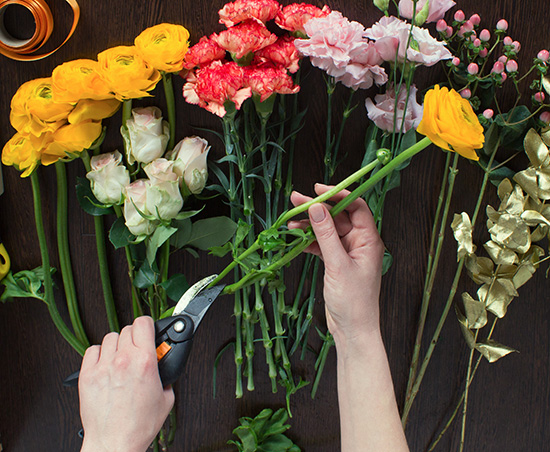 Once you’ve selected your flowers, here are a few tips to make your arrangement look like it was created by a pro! Use clear tape to create a grid across the top of your vase or container, making it easier to secure flowers in place. Next, you’ll focus on the proper size of your bouquet by making your bouquet taller than its container by about one and a half times. Create a big impact with a massive gathering of a single type of flower or mix in different textures for a monochromatic arrangement. Save larger leaves and stems to fill in around the flowers or to cover the container’s rim as a great finishing touch.