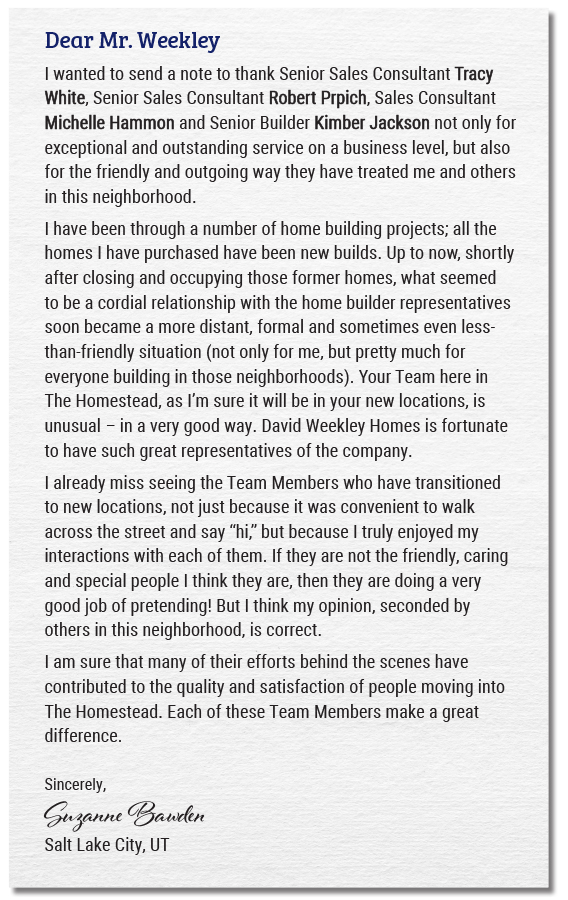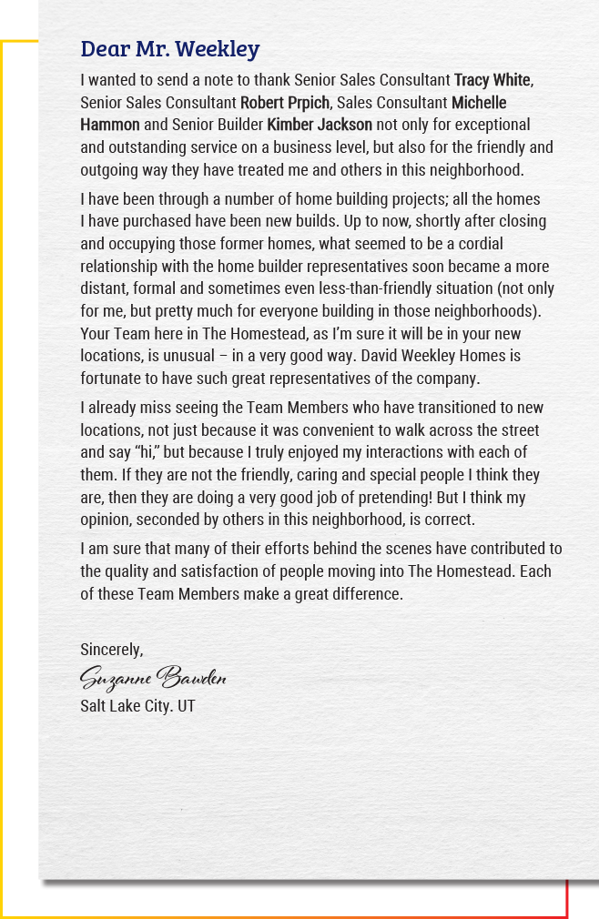 We believe our relationship starts with the Customer’s first visit before signing the contract and continues long past closing. Each Homebuyer has a dedicated Home Team, consisting of a Sales Consultant, Personal Builder, Design Consultant and Warranty Service Manager. These Team Members serve as guides, partnering to help educate our Homebuyers about our building practices and construction progress by providing them with tools and resources to help them prepare for homeownership. We regularly receive feedback on the impact this Team makes during the Homebuyer’s home building journey through letters and online Ratings and Reviews.