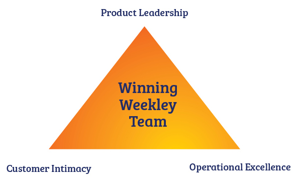 We invest in new Team Members’ development to equip them with tools and skills needed to succeed. Every new Team Member participates in Weekley 101 where they learn about the history of David Weekley Homes, our Commitment to Excellence program, benefits and culture. Our Commitment to Excellence program focuses on Product Leadership, Customer Intimacy and Operation Excellence, with the center being the Winning Weekley Team.